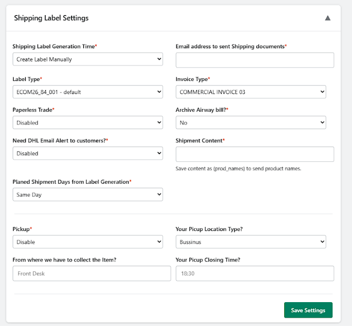 This section controls how DHL labels, invoices, notifications, and pickups behave once an order is shipped.