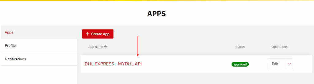 . In the portal, click on the link with your Company Name under the DHL EXPRESS – MYDHL API section.