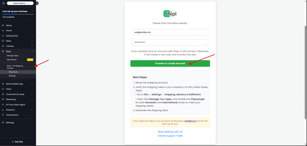 - If you already have a Shipi account, enter credentials and click Connect or Create Account.