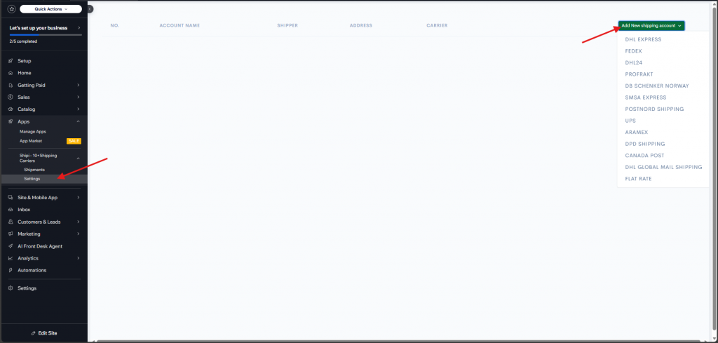 - After logging in, click Settings Menu and click Add New Shipping Account.