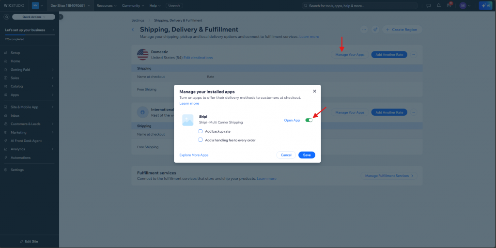 - Click Manage Your Apps in Domestic, International and enable Shipi app.